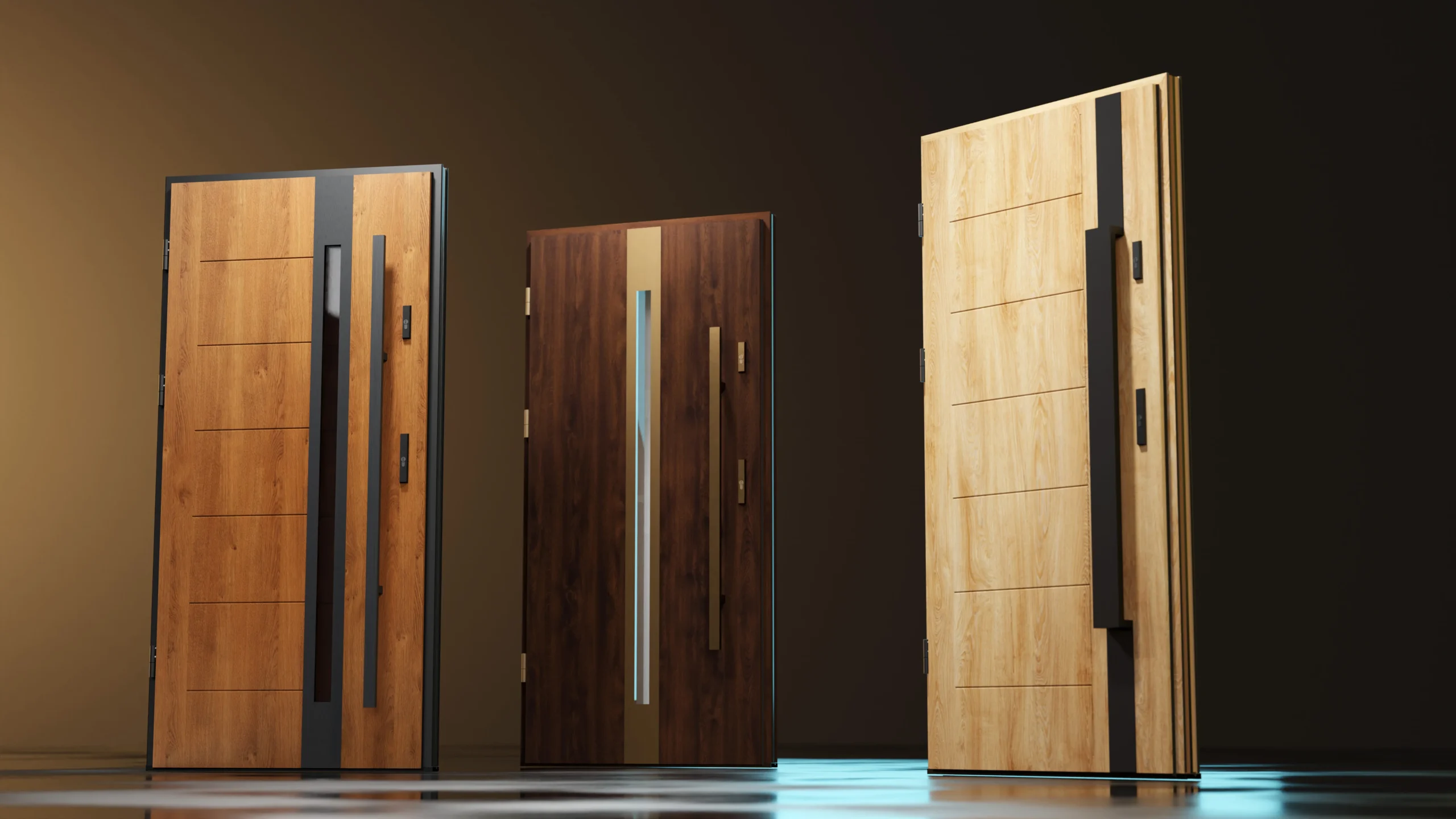 Drzwi dostępne są w różnych wariantach kolorystycznych – od nowoczesnych szarości i antracytów, po klasyczne odcienie drewna. Dzięki temu z łatwością dopasujesz drzwi do stylistyki elewacji oraz indywidualnych preferencji estetycznych.